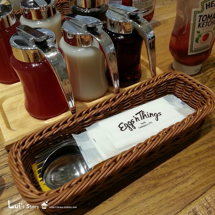 앞에 놓여있는 세가지 색상의 소스는 테이블에 기본적으로 비치되어 있는 물품입니다.