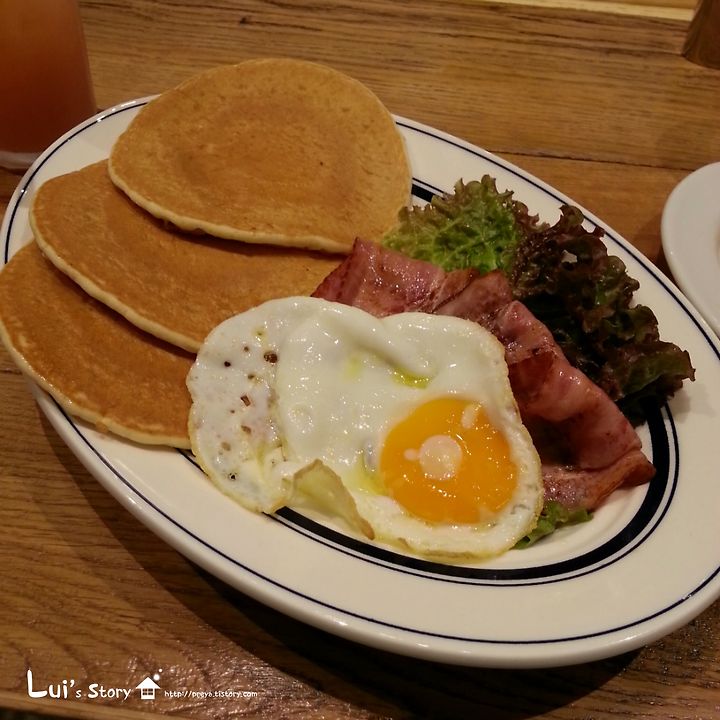 팬케이크가 세 장이나 되지만 두께가 얇은 편이라 부담스럽지는 않습니다.