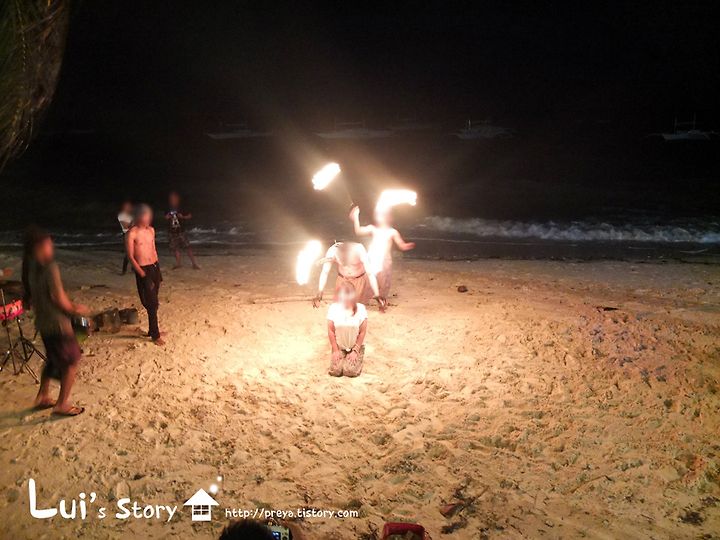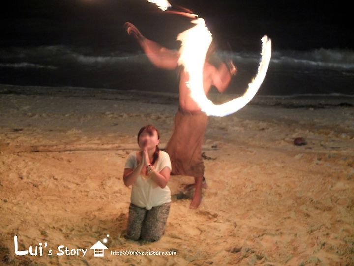 앉아있는 분에게 닿을 듯 말 듯 화려하게 빙빙 돌아가는 불..
