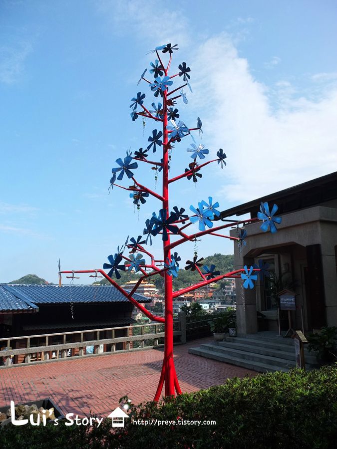 빨간 철골에 파란 바람개비 같은 꽃들이 매달려 있는데,